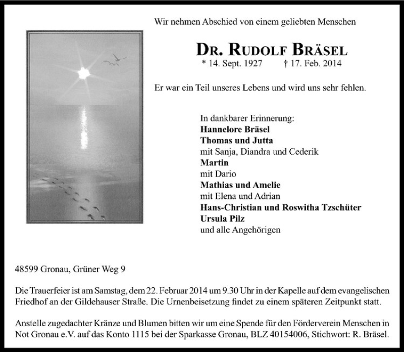 Hier finden Sie alle Traueranzeigen aus der Zeitung, die bisher für Rudolf Bräsel erschienen sind. Weitere Traueranzeigen, die in der Zeitung erscheinen, werden hier ebenfalls aufgelistet