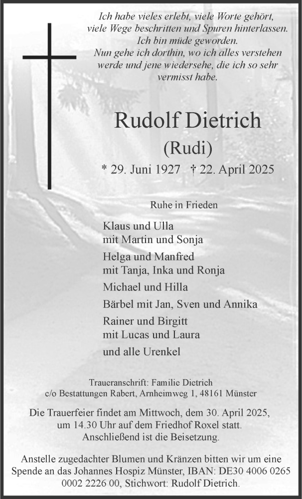 Hier finden Sie alle Traueranzeigen aus der Zeitung, die bisher für Rudolf Dietrich erschienen sind. Weitere Traueranzeigen, die in der Zeitung erscheinen, werden hier ebenfalls aufgelistet