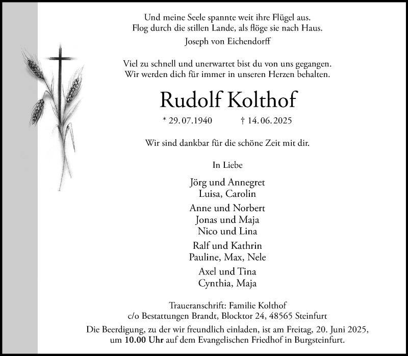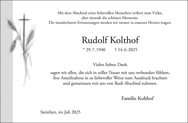 Hier finden Sie alle Traueranzeigen aus der Zeitung, die bisher für Rudolf Kolthof erschienen sind. Weitere Traueranzeigen, die in der Zeitung erscheinen, werden hier ebenfalls aufgelistet