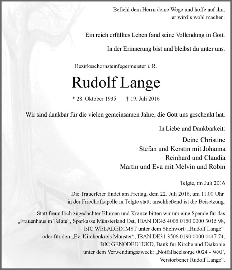 Hier finden Sie alle Traueranzeigen aus der Zeitung, die bisher für Rudolf Lange erschienen sind. Weitere Traueranzeigen, die in der Zeitung erscheinen, werden hier ebenfalls aufgelistet