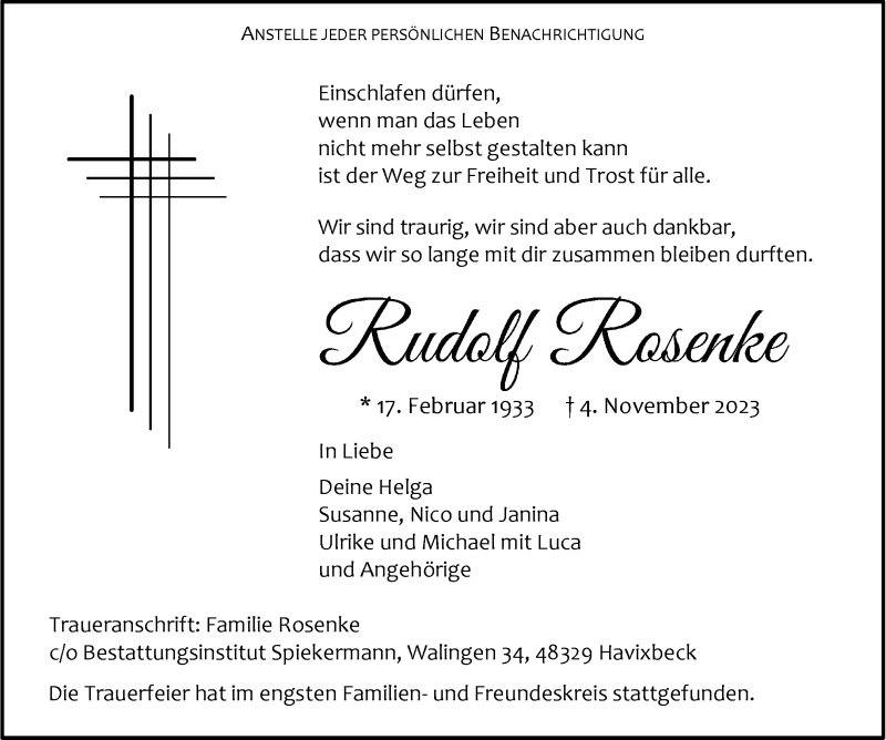 Hier finden Sie alle Traueranzeigen aus der Zeitung, die bisher für Rudolf Rosenke erschienen sind. Weitere Traueranzeigen, die in der Zeitung erscheinen, werden hier ebenfalls aufgelistet
