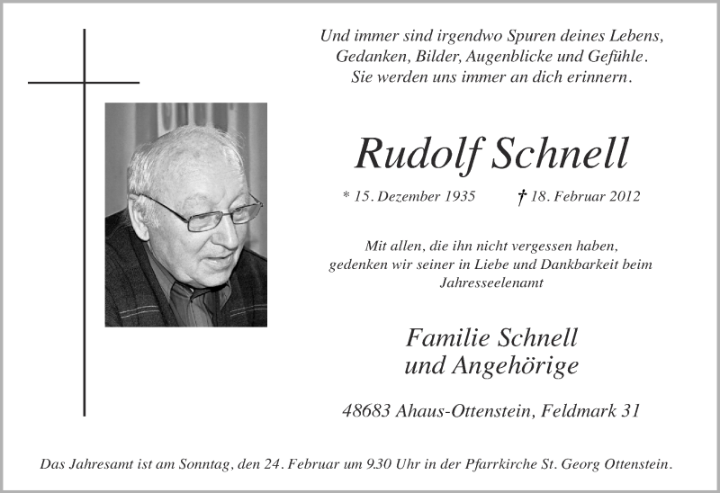 Hier finden Sie alle Traueranzeigen aus der Zeitung, die bisher für Rudolf Schnell erschienen sind. Weitere Traueranzeigen, die in der Zeitung erscheinen, werden hier ebenfalls aufgelistet