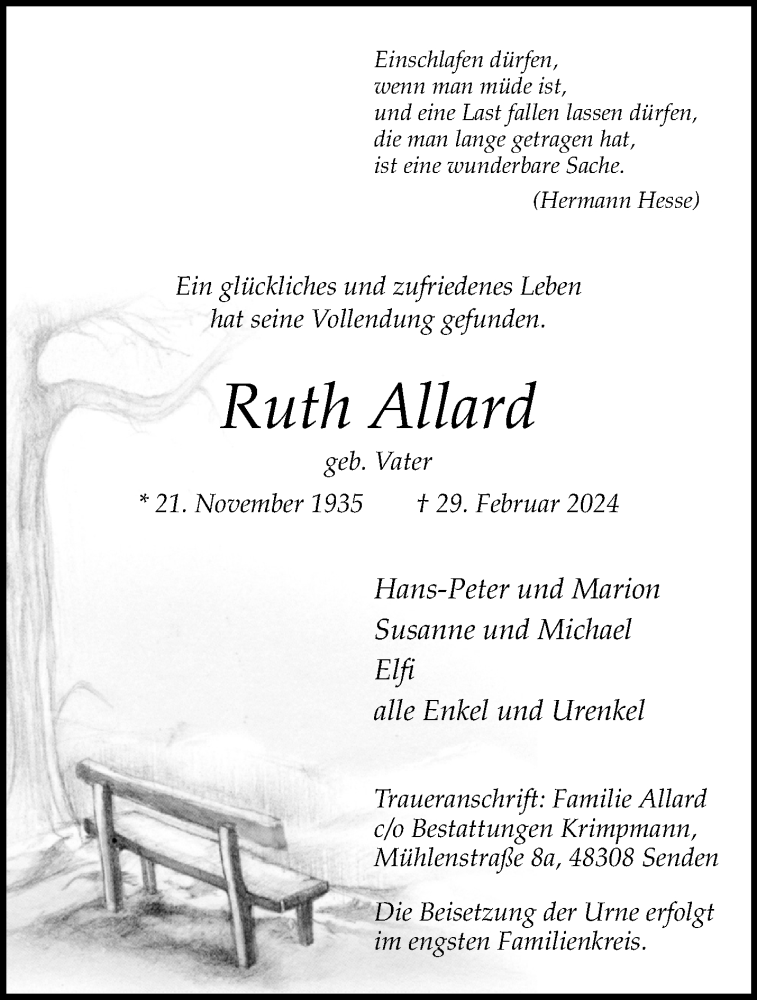 Hier finden Sie alle Traueranzeigen aus der Zeitung, die bisher für Ruth Allard erschienen sind. Weitere Traueranzeigen, die in der Zeitung erscheinen, werden hier ebenfalls aufgelistet