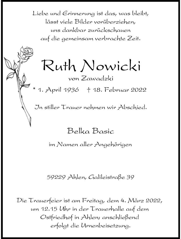 Hier finden Sie alle Traueranzeigen aus der Zeitung, die bisher für Ruth Nowicki erschienen sind. Weitere Traueranzeigen, die in der Zeitung erscheinen, werden hier ebenfalls aufgelistet
