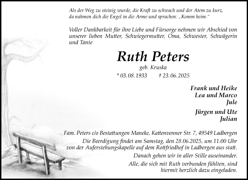 Hier finden Sie alle Traueranzeigen aus der Zeitung, die bisher für Ruth Peters erschienen sind. Weitere Traueranzeigen, die in der Zeitung erscheinen, werden hier ebenfalls aufgelistet