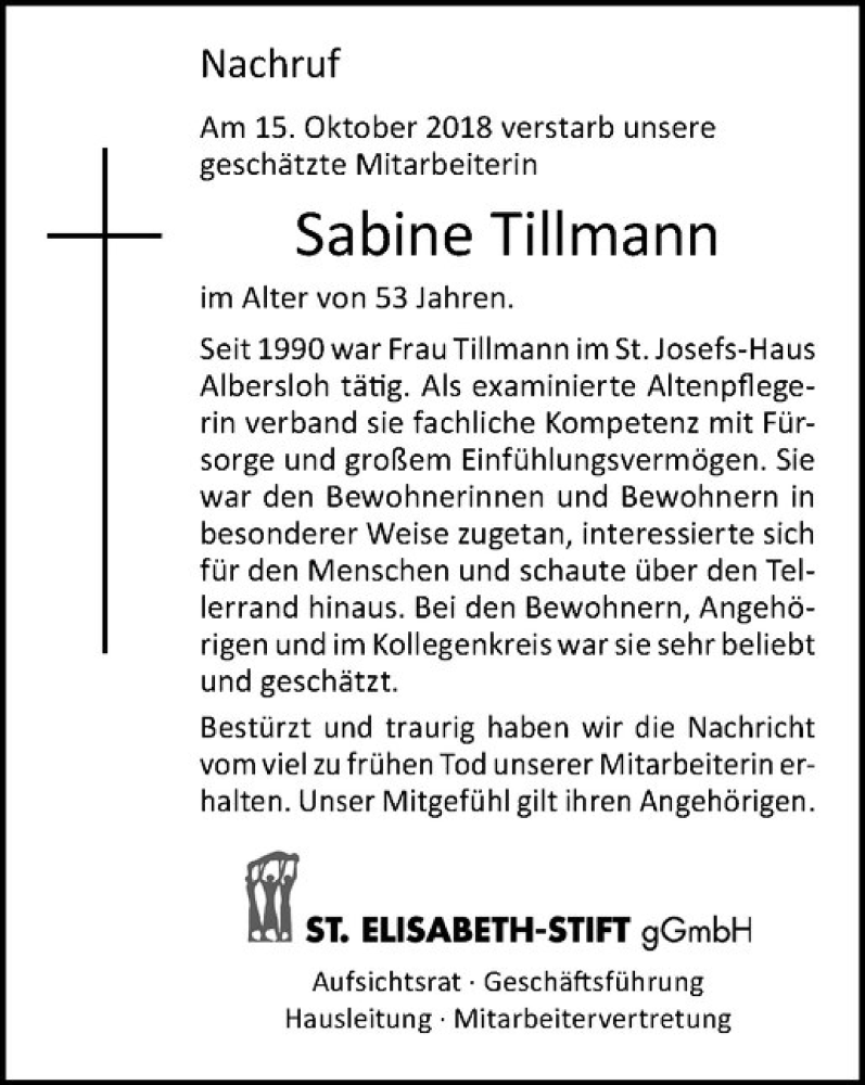 Hier finden Sie alle Traueranzeigen aus der Zeitung, die bisher für Sabine Tillmann erschienen sind. Weitere Traueranzeigen, die in der Zeitung erscheinen, werden hier ebenfalls aufgelistet