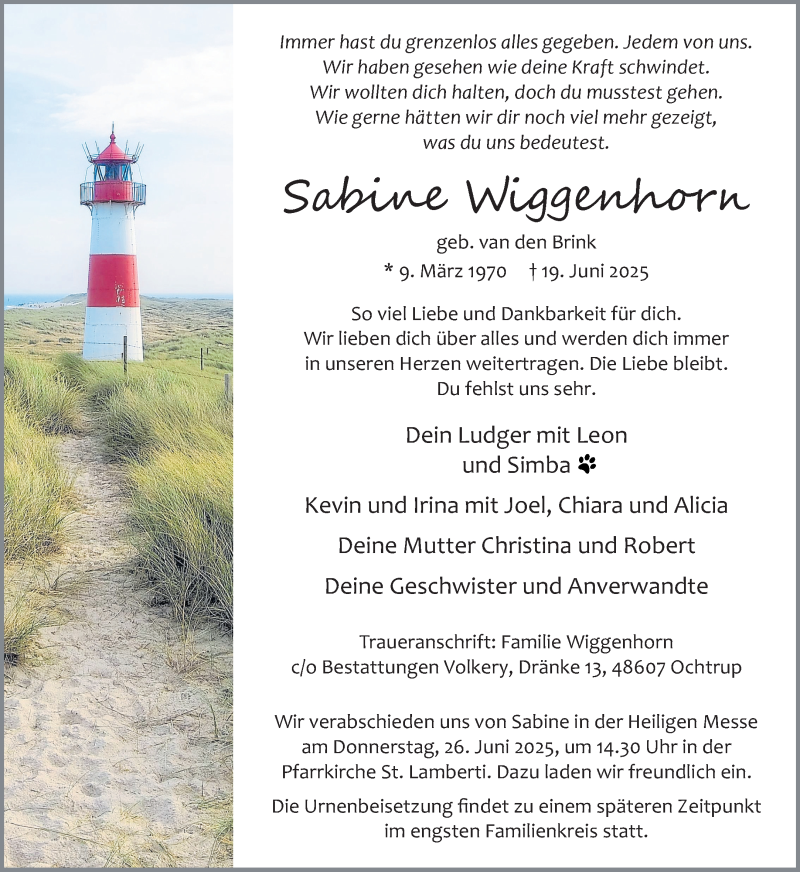 Hier finden Sie alle Traueranzeigen aus der Zeitung, die bisher für Sabine Wiggenhorn erschienen sind. Weitere Traueranzeigen, die in der Zeitung erscheinen, werden hier ebenfalls aufgelistet