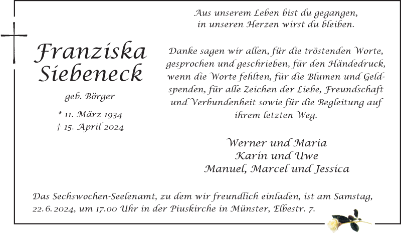 Hier finden Sie alle Traueranzeigen aus der Zeitung, die bisher für Franziska Siebeneck erschienen sind. Weitere Traueranzeigen, die in der Zeitung erscheinen, werden hier ebenfalls aufgelistet