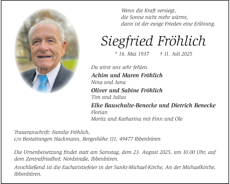 Hier finden Sie alle Traueranzeigen aus der Zeitung, die bisher für Siegfried Fröhlich erschienen sind. Weitere Traueranzeigen, die in der Zeitung erscheinen, werden hier ebenfalls aufgelistet