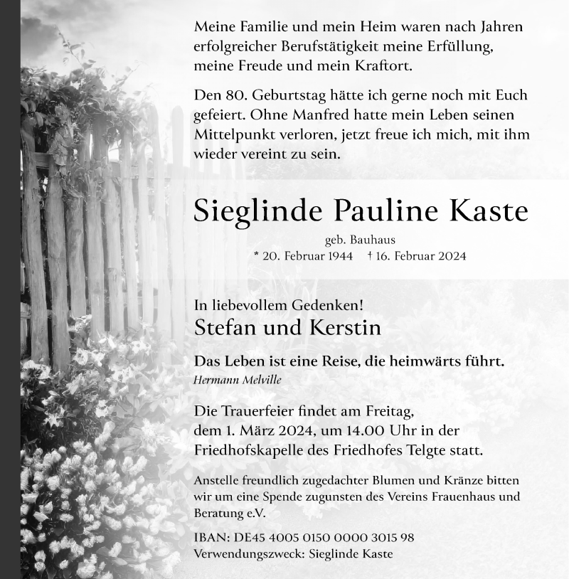 Hier finden Sie alle Traueranzeigen aus der Zeitung, die bisher für Sieglinde Pauline Kaste erschienen sind. Weitere Traueranzeigen, die in der Zeitung erscheinen, werden hier ebenfalls aufgelistet