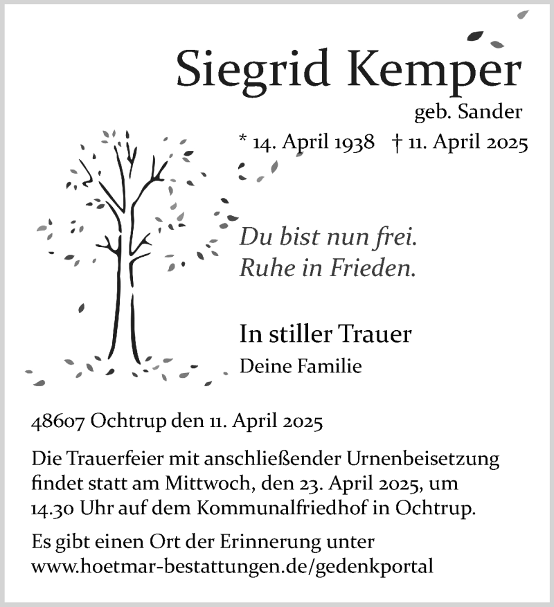Hier finden Sie alle Traueranzeigen aus der Zeitung, die bisher für Siegrid Kemper erschienen sind. Weitere Traueranzeigen, die in der Zeitung erscheinen, werden hier ebenfalls aufgelistet