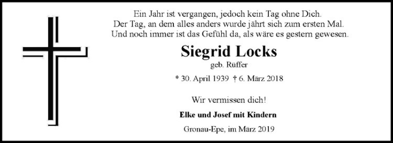 Hier finden Sie alle Traueranzeigen aus der Zeitung, die bisher für Siegrid Locks erschienen sind. Weitere Traueranzeigen, die in der Zeitung erscheinen, werden hier ebenfalls aufgelistet
