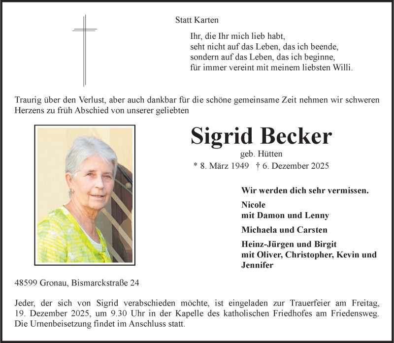 Hier finden Sie alle Traueranzeigen aus der Zeitung, die bisher für Sigrid Becker erschienen sind. Weitere Traueranzeigen, die in der Zeitung erscheinen, werden hier ebenfalls aufgelistet