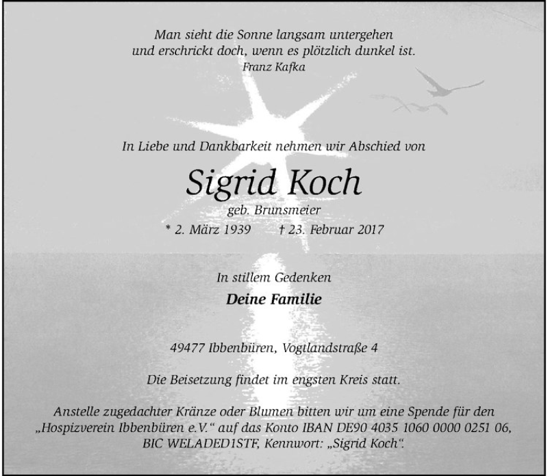 Hier finden Sie alle Traueranzeigen aus der Zeitung, die bisher für Sigrid Koch erschienen sind. Weitere Traueranzeigen, die in der Zeitung erscheinen, werden hier ebenfalls aufgelistet