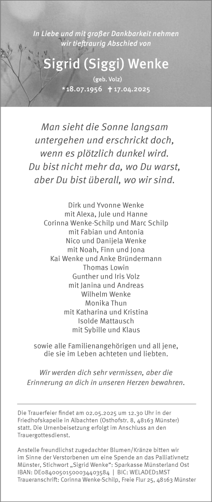 Hier finden Sie alle Traueranzeigen aus der Zeitung, die bisher für Sigrid Wenke erschienen sind. Weitere Traueranzeigen, die in der Zeitung erscheinen, werden hier ebenfalls aufgelistet