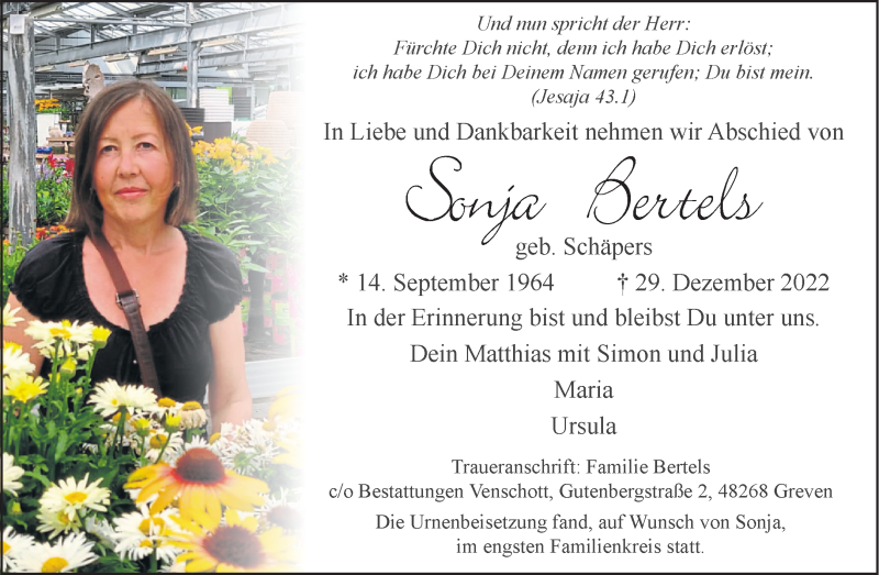 Hier finden Sie alle Traueranzeigen aus der Zeitung, die bisher für Sonja Bertels erschienen sind. Weitere Traueranzeigen, die in der Zeitung erscheinen, werden hier ebenfalls aufgelistet