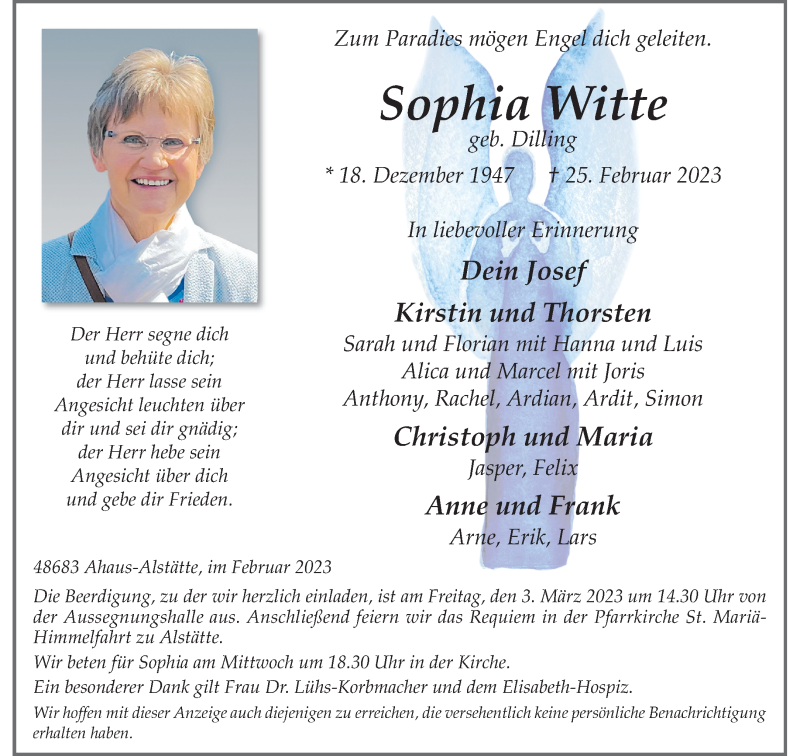 Hier finden Sie alle Traueranzeigen aus der Zeitung, die bisher für Sophia Witte erschienen sind. Weitere Traueranzeigen, die in der Zeitung erscheinen, werden hier ebenfalls aufgelistet