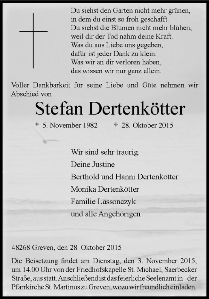Hier finden Sie alle Traueranzeigen aus der Zeitung, die bisher für Stefan Dertenkötter erschienen sind. Weitere Traueranzeigen, die in der Zeitung erscheinen, werden hier ebenfalls aufgelistet