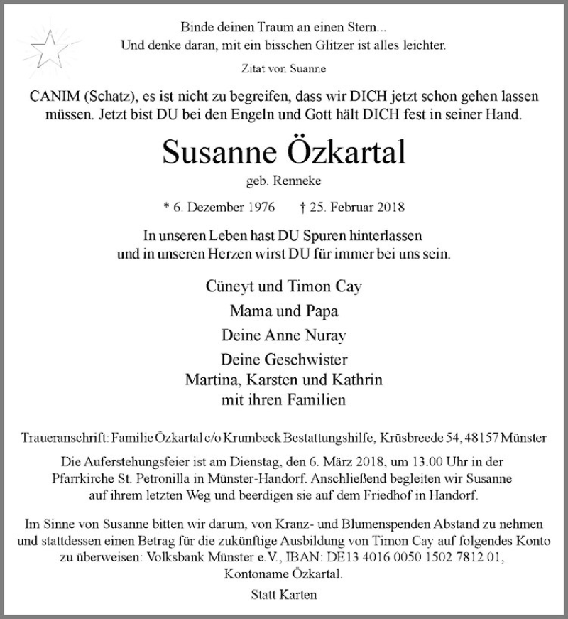 Hier finden Sie alle Traueranzeigen aus der Zeitung, die bisher für Susanne Özkartal erschienen sind. Weitere Traueranzeigen, die in der Zeitung erscheinen, werden hier ebenfalls aufgelistet