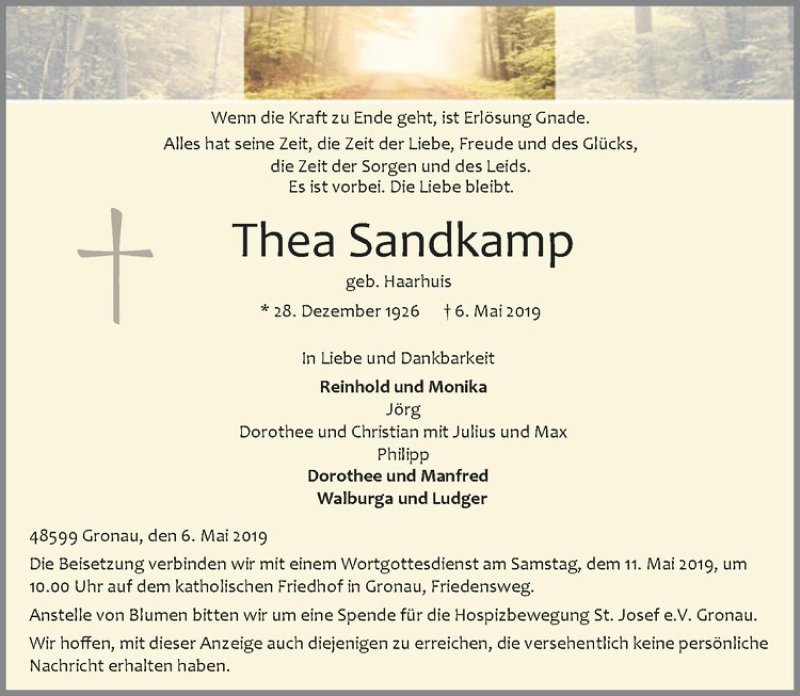 Hier finden Sie alle Traueranzeigen aus der Zeitung, die bisher für Thea Sandkamp erschienen sind. Weitere Traueranzeigen, die in der Zeitung erscheinen, werden hier ebenfalls aufgelistet