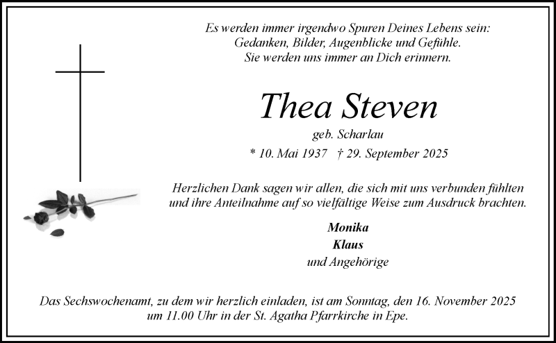 Hier finden Sie alle Traueranzeigen aus der Zeitung, die bisher für Thea Steven erschienen sind. Weitere Traueranzeigen, die in der Zeitung erscheinen, werden hier ebenfalls aufgelistet