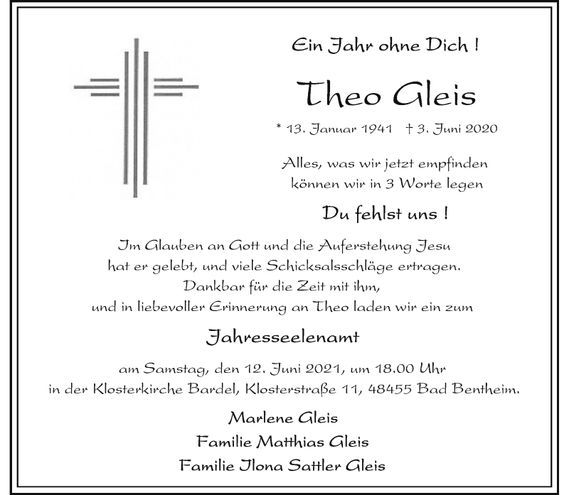Hier finden Sie alle Traueranzeigen aus der Zeitung, die bisher für Theo Gleis erschienen sind. Weitere Traueranzeigen, die in der Zeitung erscheinen, werden hier ebenfalls aufgelistet