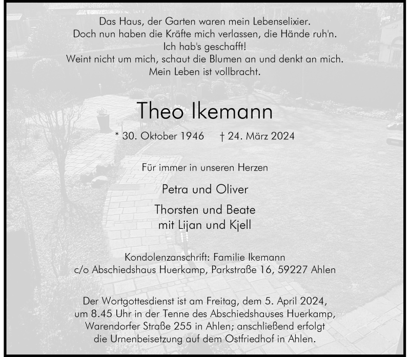 Hier finden Sie alle Traueranzeigen aus der Zeitung, die bisher für Theo Ikemann erschienen sind. Weitere Traueranzeigen, die in der Zeitung erscheinen, werden hier ebenfalls aufgelistet