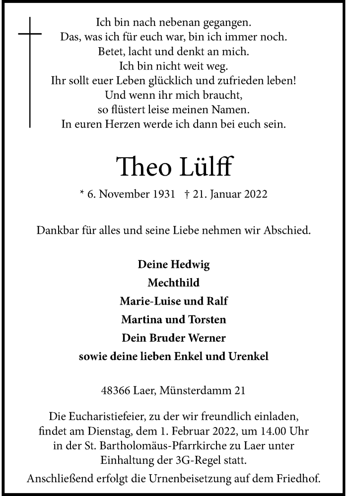 Hier finden Sie alle Traueranzeigen aus der Zeitung, die bisher für Theo Lülff erschienen sind. Weitere Traueranzeigen, die in der Zeitung erscheinen, werden hier ebenfalls aufgelistet