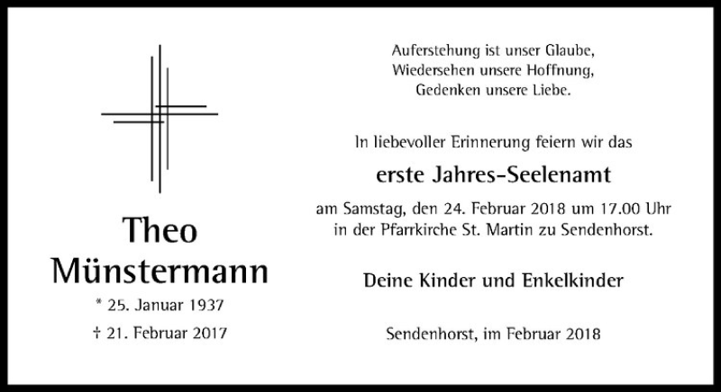 Hier finden Sie alle Traueranzeigen aus der Zeitung, die bisher für Theo Münstermann erschienen sind. Weitere Traueranzeigen, die in der Zeitung erscheinen, werden hier ebenfalls aufgelistet