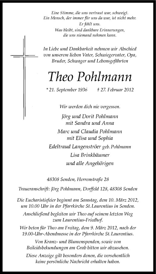 Hier finden Sie alle Traueranzeigen aus der Zeitung, die bisher für Theo Pohlmann erschienen sind. Weitere Traueranzeigen, die in der Zeitung erscheinen, werden hier ebenfalls aufgelistet