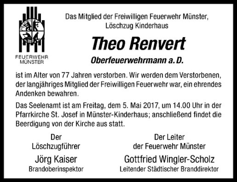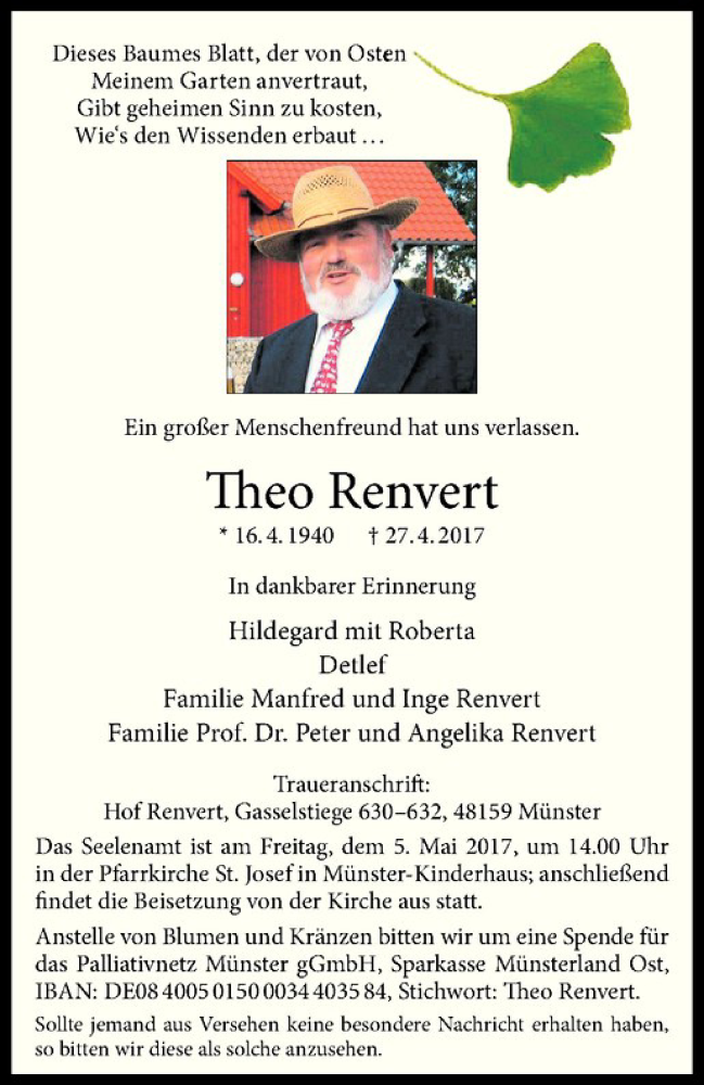 Hier finden Sie alle Traueranzeigen aus der Zeitung, die bisher für Theo Renvert erschienen sind. Weitere Traueranzeigen, die in der Zeitung erscheinen, werden hier ebenfalls aufgelistet