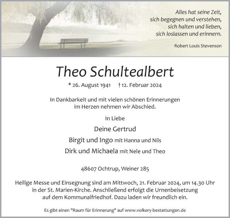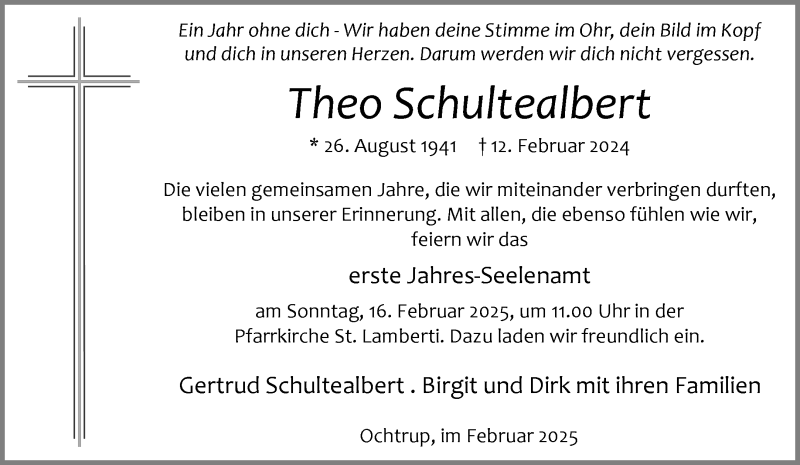 Hier finden Sie alle Traueranzeigen aus der Zeitung, die bisher für Theo Schultealbert erschienen sind. Weitere Traueranzeigen, die in der Zeitung erscheinen, werden hier ebenfalls aufgelistet