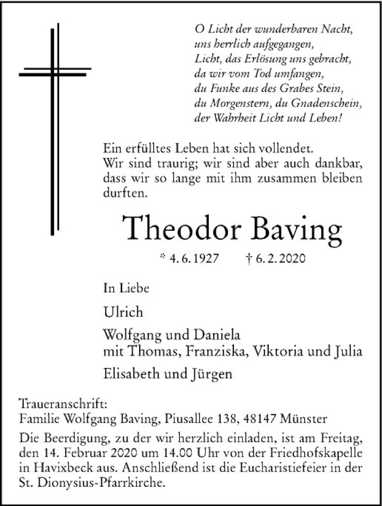 Hier finden Sie alle Traueranzeigen aus der Zeitung, die bisher für Theodor Baving erschienen sind. Weitere Traueranzeigen, die in der Zeitung erscheinen, werden hier ebenfalls aufgelistet