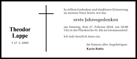 Hier finden Sie alle Traueranzeigen aus der Zeitung, die bisher für Theodor Lappe erschienen sind. Weitere Traueranzeigen, die in der Zeitung erscheinen, werden hier ebenfalls aufgelistet