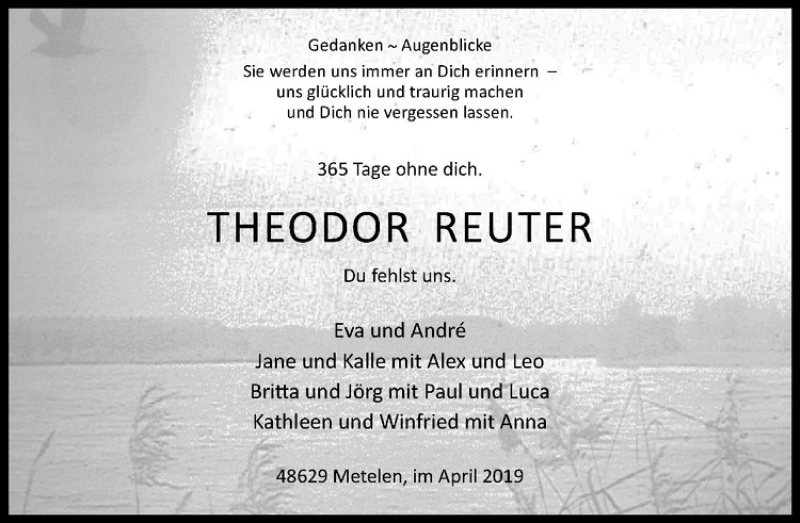 Hier finden Sie alle Traueranzeigen aus der Zeitung, die bisher für Theodor Reuter erschienen sind. Weitere Traueranzeigen, die in der Zeitung erscheinen, werden hier ebenfalls aufgelistet
