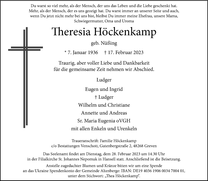 Hier finden Sie alle Traueranzeigen aus der Zeitung, die bisher für Theresia Höckenkamp erschienen sind. Weitere Traueranzeigen, die in der Zeitung erscheinen, werden hier ebenfalls aufgelistet