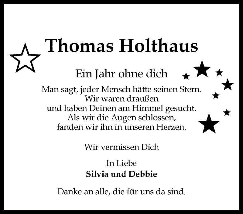 Hier finden Sie alle Traueranzeigen aus der Zeitung, die bisher für Thomas Holthaus erschienen sind. Weitere Traueranzeigen, die in der Zeitung erscheinen, werden hier ebenfalls aufgelistet