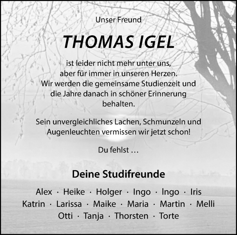 Hier finden Sie alle Traueranzeigen aus der Zeitung, die bisher für Thomas Igel erschienen sind. Weitere Traueranzeigen, die in der Zeitung erscheinen, werden hier ebenfalls aufgelistet