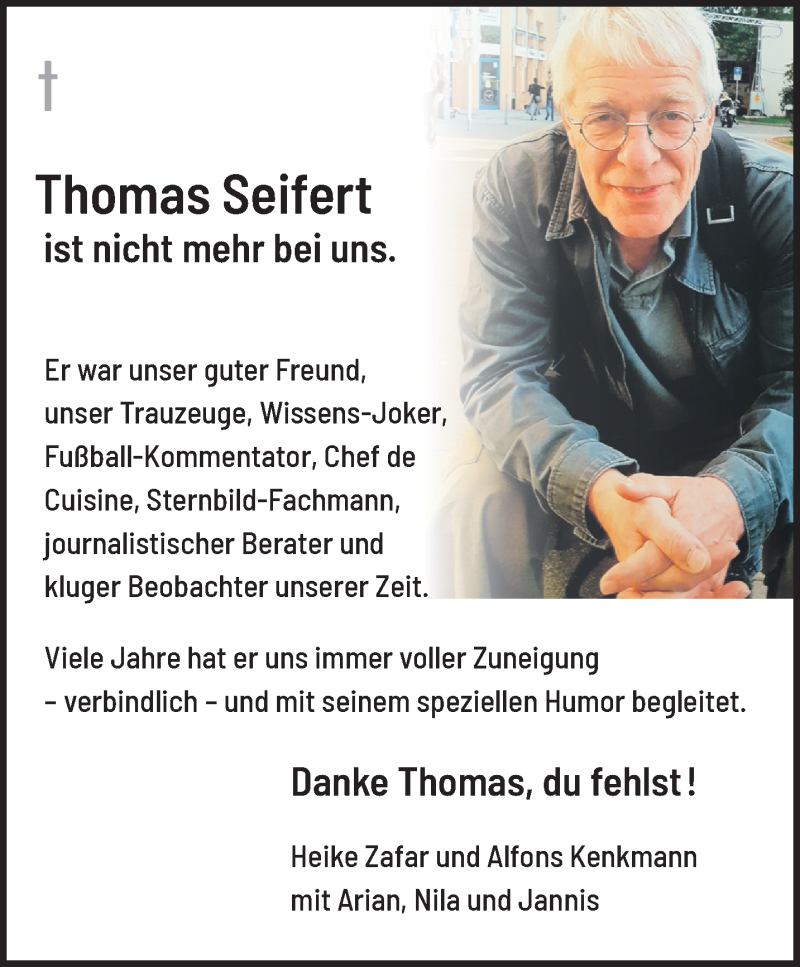 Hier finden Sie alle Traueranzeigen aus der Zeitung, die bisher für Thomas Seifert erschienen sind. Weitere Traueranzeigen, die in der Zeitung erscheinen, werden hier ebenfalls aufgelistet
