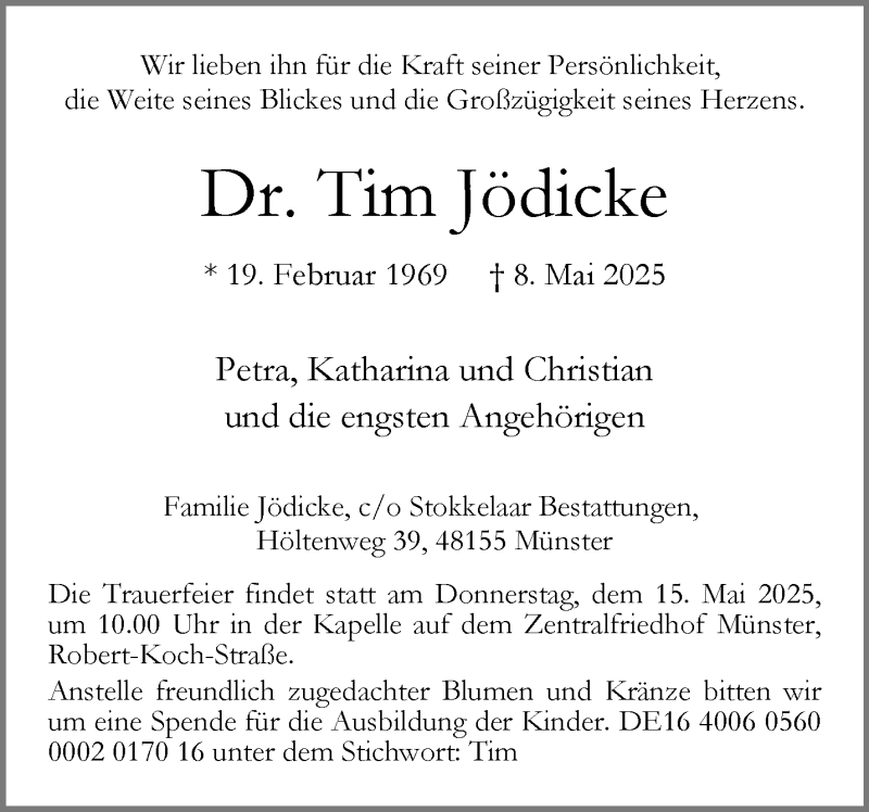 Hier finden Sie alle Traueranzeigen aus der Zeitung, die bisher für Dr. Tim Jödicke erschienen sind. Weitere Traueranzeigen, die in der Zeitung erscheinen, werden hier ebenfalls aufgelistet
