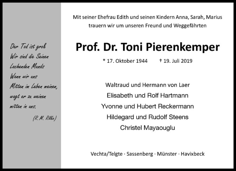 Hier finden Sie alle Traueranzeigen aus der Zeitung, die bisher für Toni Pierenkemper erschienen sind. Weitere Traueranzeigen, die in der Zeitung erscheinen, werden hier ebenfalls aufgelistet