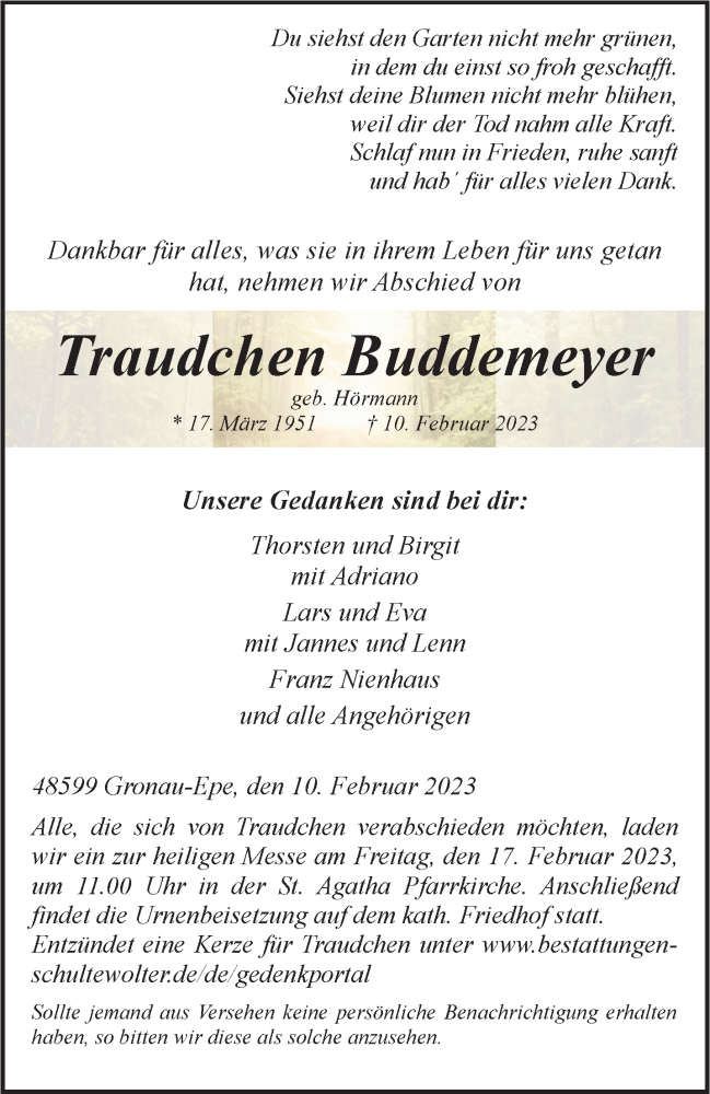 Hier finden Sie alle Traueranzeigen aus der Zeitung, die bisher für Traudchen Buddemeyer erschienen sind. Weitere Traueranzeigen, die in der Zeitung erscheinen, werden hier ebenfalls aufgelistet