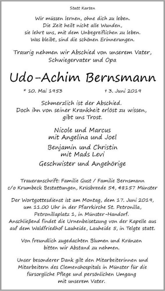 Hier finden Sie alle Traueranzeigen aus der Zeitung, die bisher für Udo-Achim Bernsmann erschienen sind. Weitere Traueranzeigen, die in der Zeitung erscheinen, werden hier ebenfalls aufgelistet