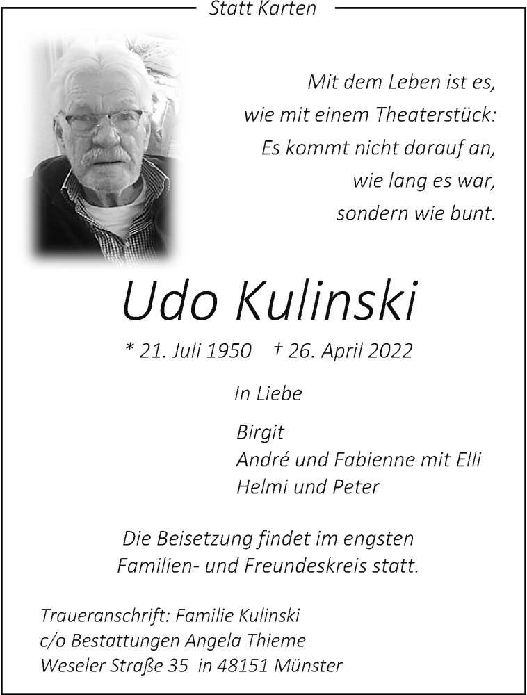 Hier finden Sie alle Traueranzeigen aus der Zeitung, die bisher für Udo Kulinski erschienen sind. Weitere Traueranzeigen, die in der Zeitung erscheinen, werden hier ebenfalls aufgelistet