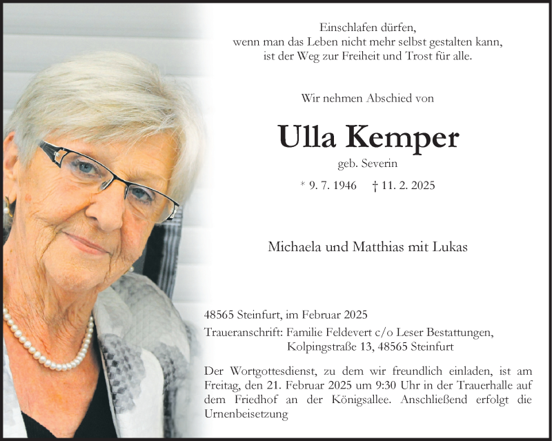 Hier finden Sie alle Traueranzeigen aus der Zeitung, die bisher für Ulla Kemper erschienen sind. Weitere Traueranzeigen, die in der Zeitung erscheinen, werden hier ebenfalls aufgelistet