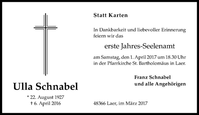 Hier finden Sie alle Traueranzeigen aus der Zeitung, die bisher für Ulla Schnabel erschienen sind. Weitere Traueranzeigen, die in der Zeitung erscheinen, werden hier ebenfalls aufgelistet