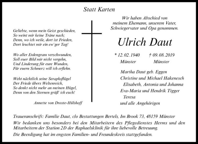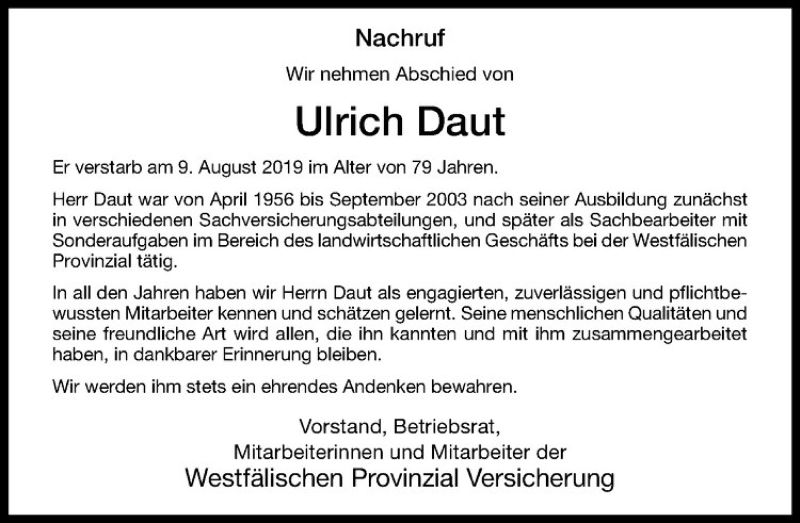Hier finden Sie alle Traueranzeigen aus der Zeitung, die bisher für Ulrich Daut erschienen sind. Weitere Traueranzeigen, die in der Zeitung erscheinen, werden hier ebenfalls aufgelistet