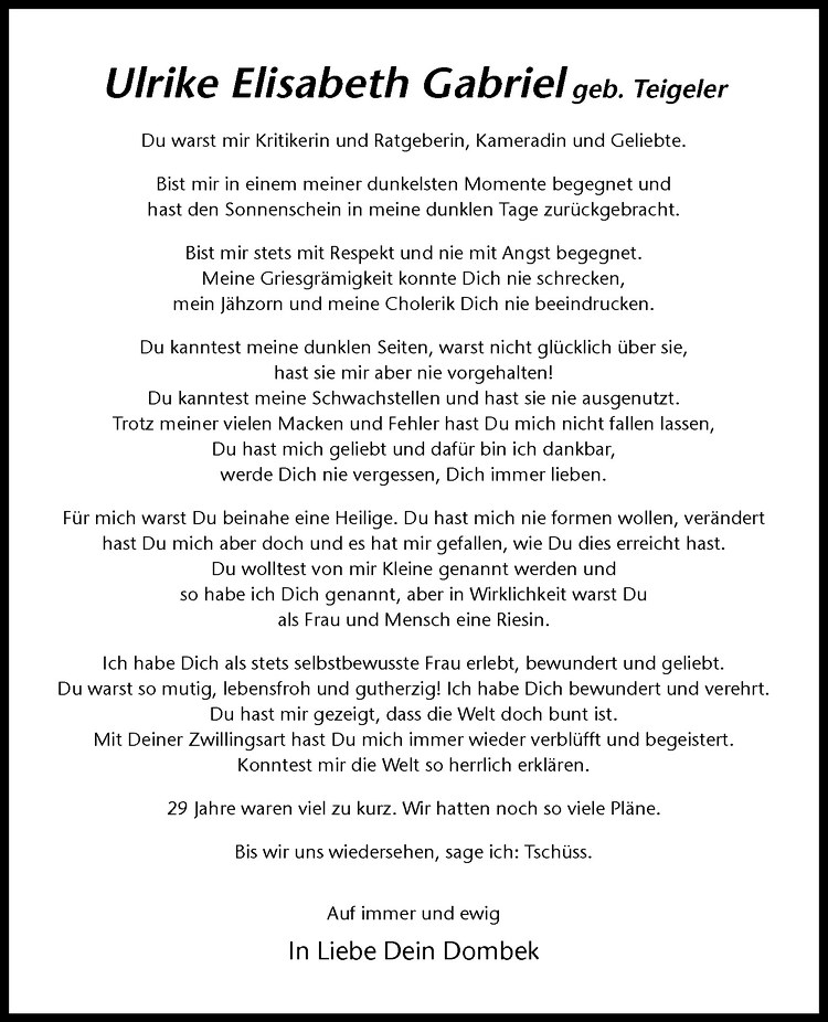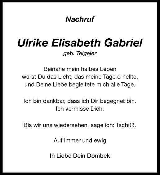 Hier finden Sie alle Traueranzeigen aus der Zeitung, die bisher für Ulrike Elisabeth Gabriel erschienen sind. Weitere Traueranzeigen, die in der Zeitung erscheinen, werden hier ebenfalls aufgelistet