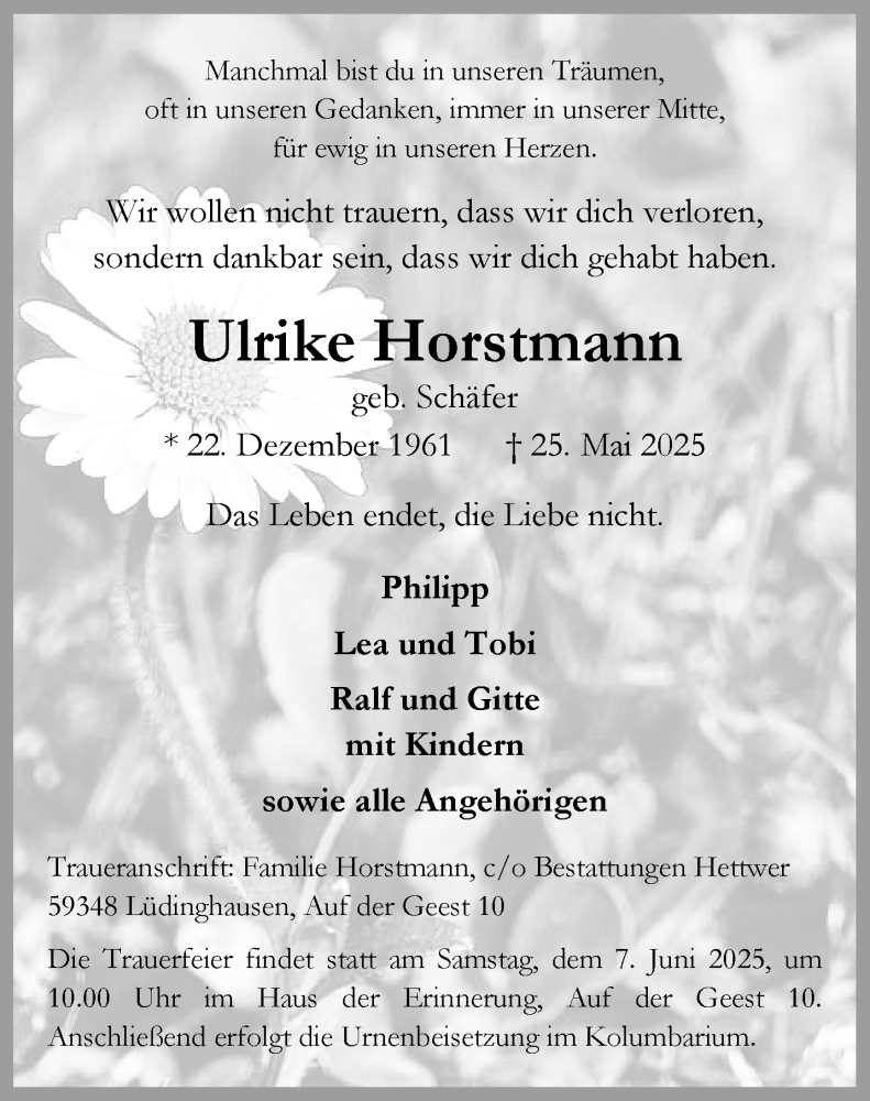 Hier finden Sie alle Traueranzeigen aus der Zeitung, die bisher für Ulrike Horstmann erschienen sind. Weitere Traueranzeigen, die in der Zeitung erscheinen, werden hier ebenfalls aufgelistet