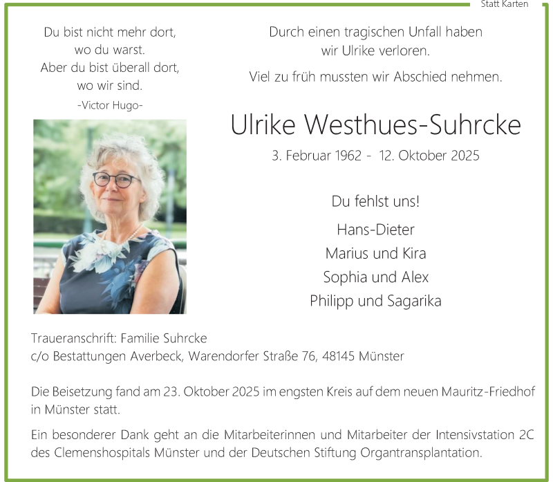 Hier finden Sie alle Traueranzeigen aus der Zeitung, die bisher für Ulrike Westhues-Suhrcke erschienen sind. Weitere Traueranzeigen, die in der Zeitung erscheinen, werden hier ebenfalls aufgelistet